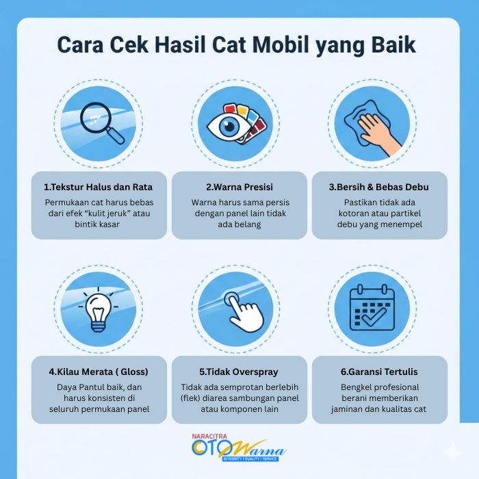 Otowarna selalu memberikan edukasi kepada setiap konsumen awam bagaimana mengecek pengerjaan hasil dari teknisi kami berikut salah satu checklist yang kami sarankan untuk mengecek Hasil Cat Mobil yang Baik setelah melakukan Body Repair